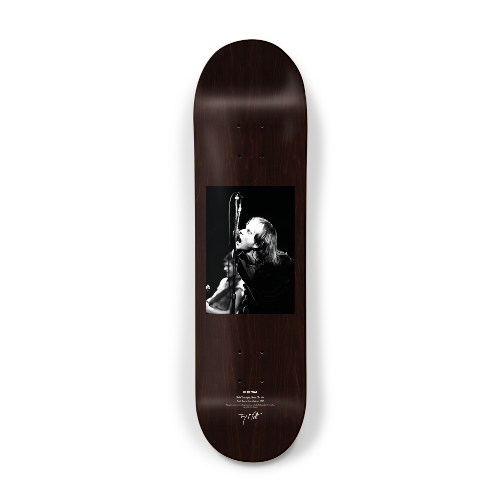 Eternal Skateboards are honoured to work together with Tony Mott to bring you this series of decks featuring some of Australia’s finest rock artists. These are the people who have provided to the soundtrack to life in Australia and are loved all around the world. We have the schoolgirl, the rock star, the activist, the immortal, the pop princess, the punk… and of course Tex. All caught by the master lens-man knowing the exact microsecond to press the button to capture the energy and beauty of these amazing artists in full flight.